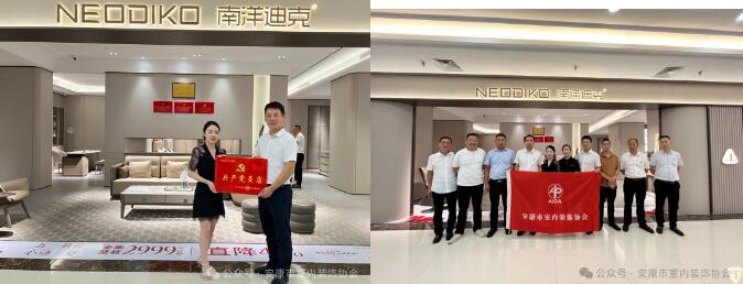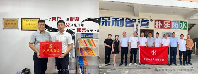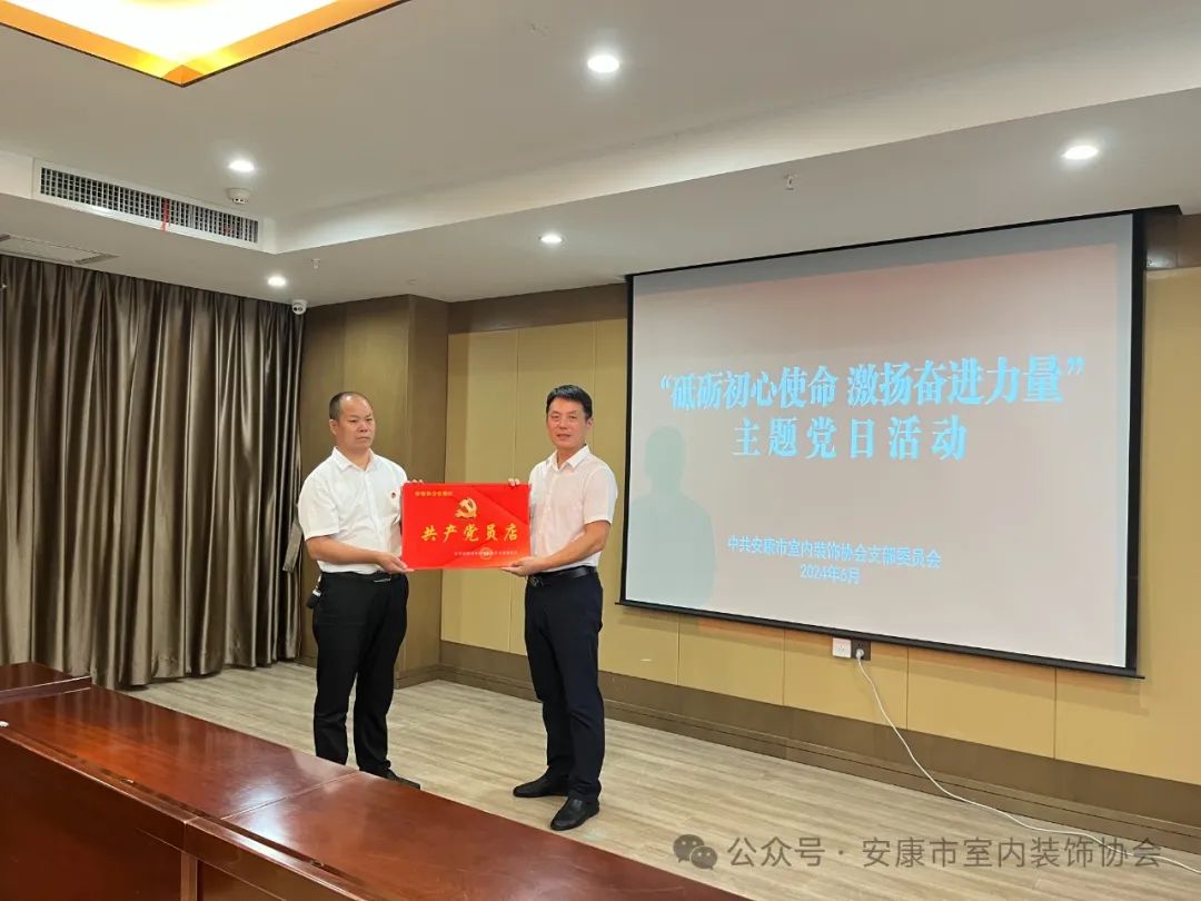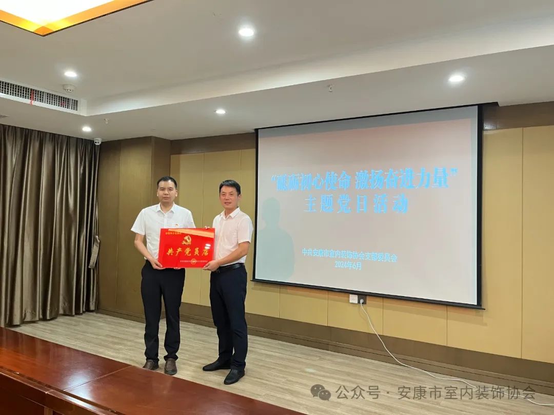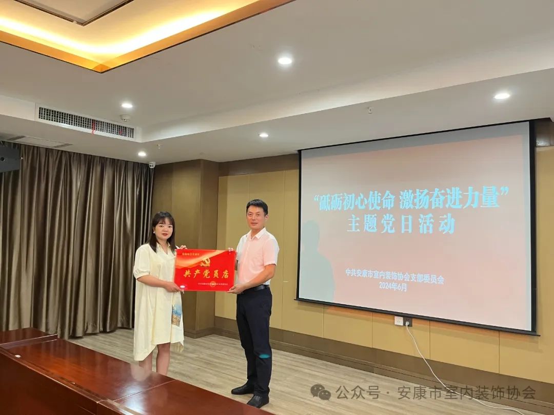 为热烈庆祝中国共产党建党103周年,创新践行“把支部建在门店、党员敢于亮身份”的亮点做法,进一步激发党员的先锋引领作用,感染和提高企业员工的爱党爱国热情,6月28日下午,安康市室内装饰协会党支部组织“砥砺初心使命 激扬奋进力量”庆七一主题党日活动。活动分为两大板块:一、走访党员会员企业,颁发“装饰协会党旗红·共产党员店”牌匾。二、参观安康市党群服务中心,交流参观学习心得。党支部书记兼副会长杨冲、组织委员唐祥、宣传委员王欢,副监事长杨思军、监事曹英波以及八家党员会员企业负责人等代表参与此次主题活动。
